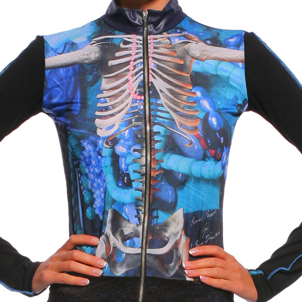 Интересная олимпийка из мягкого трикотажа с весьма оригинальным принтом в висте костей. Воротник-стойка, застежка-молния, длинные рукава с декоративной полосой. Эта модель из новой коллекции Homo Virtuality сезона осень-зима 2010/11 от дизайнерского дуэта "2 сорванные башни".