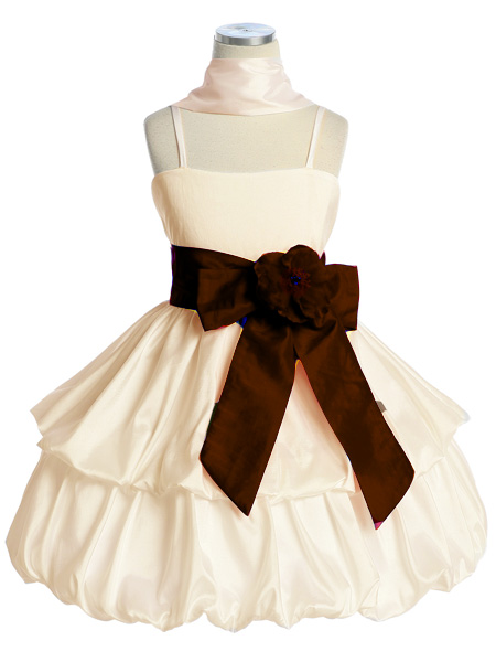Лиф платья крепится на плечах за счет тонких бретелек. Цвет нежный и красивый – слоновая кость очень светлого оттенка. Юбка в два слоя пышная и роскошная. Линия тали украшена роскошным поясом с огромным красивым бантом цвета Шампань.