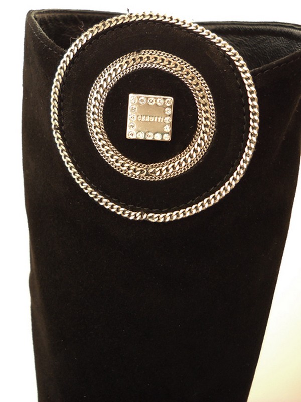Выполненные из черной замши, они имеют аккуратной формы мыс. Невысокая обтяжная танкетка смотрится аккуратно и гармонично. Подошва резиновая. Голенище без молнии, прямое. Высота голенища 39 см. Для дамы с невысоким подъемом.