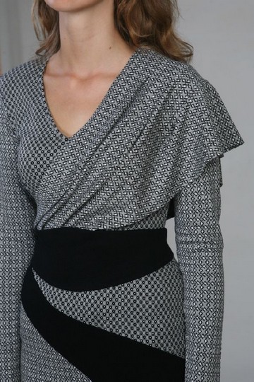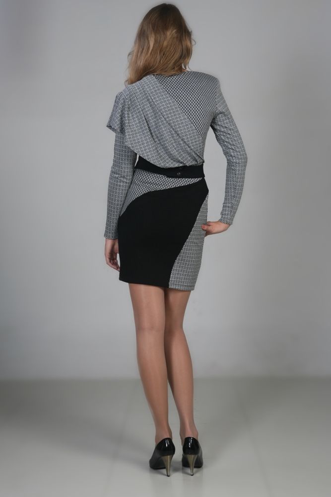 Стильная элегантная модель сложного кроя. Сочетание серого и черного всегда эффектно. А в этом платье с большим вкусом и фантазией обыграны еще и ткани с различным рисунком.