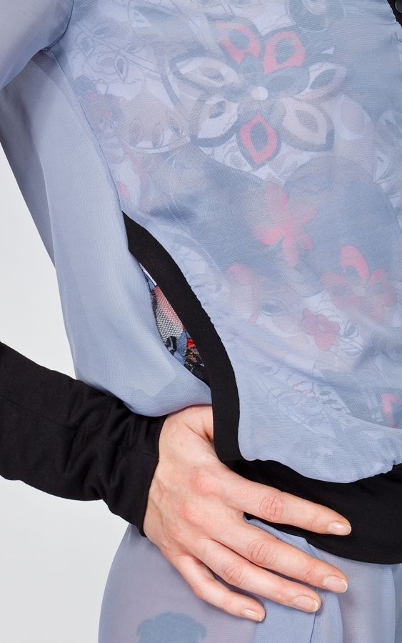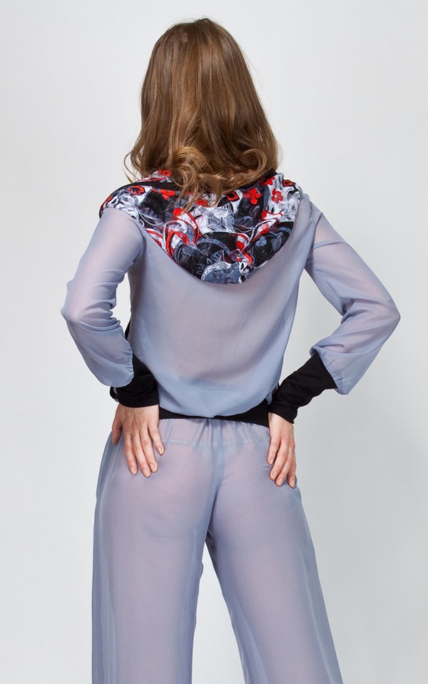 Кто сказал, что спортивный стиль не может быть женственным и сексуальным? Тогда обратите внимание на эту шифоновую олимпийку из новой коллекции творческого дуэта «Две сорванные башни»! Легкая курточка двухслойная – нижний уровень с красочным принтом просвечивает сквозь полупрозрачный шифон василькового цвета и, словно бутон, расцветает всеми красками на капюшоне. Отделка изделия выполнена из черного материала, контрастирующего с основным колером.
