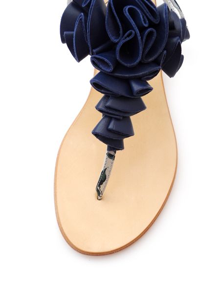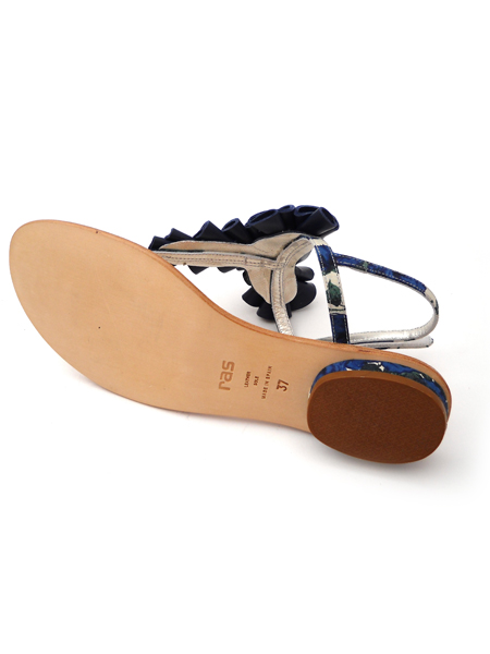 Именно так подумали испанские дизайнеры модной обуви, и в результате мы видим эти чУдные сандалии. Крупные воланы из натуральной кожи темно-синего цвета формируют пышное жабо. Отделка тканью с цветочным принтом добавляет образу романтический флер.