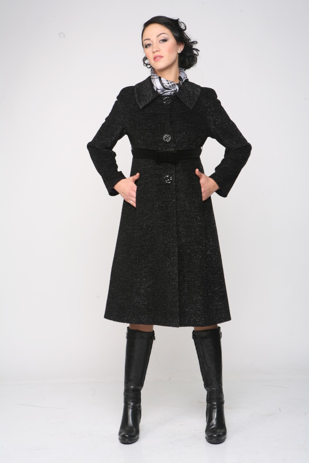 Пальто чёрного цвета с вкраплением люрекса и бархатным бантом под грудью.