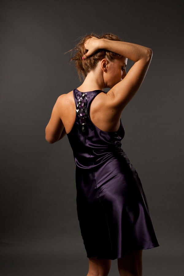 Струящаяся по телу атласная ткань притягательного глубокого фиолетового цвета, лаконичный крой, приталенный силуэт, сдержанная длина миди создают реальную альтернативу классическому маленькому черному платью.