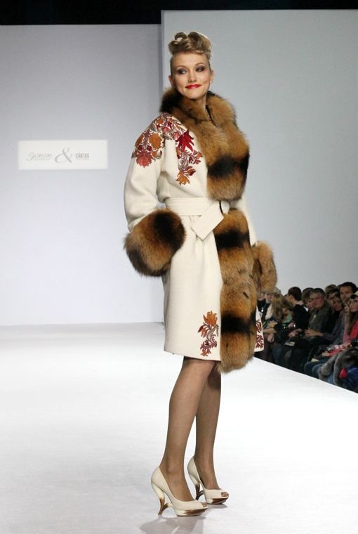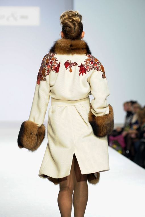 Пальто выполнено из 100% кашемира и украшено оригинальной красной аппликацией в стиле павлопосадских узоров. Манжеты и воротник модели оторочены роскошным мехом русского песца. Пальто застегивается на широкий ремень с элитной итальянской пряжкой.