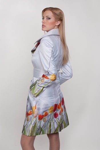 На ультрамодном белом фоне плаща «расцвели» нежные и прекрасные весенние цветы - тюльпаны. Теперь все взгляды окружающих будут принадлежать только вам – таинственной и загадочной незнакомке в очаровательном коротком плаще.