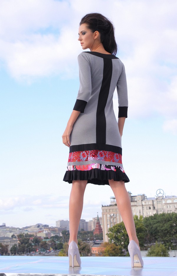 Его успех объясняется умелым сочетанием профессионально подобранного покроя и декора. Прямой приталенный силуэт очень комфортен, а яркая вертикальная вставка, перекликающаяся с оборкой и обрамленная контрастными рюшами, придает силуэту стройность и в то же время динамичность.