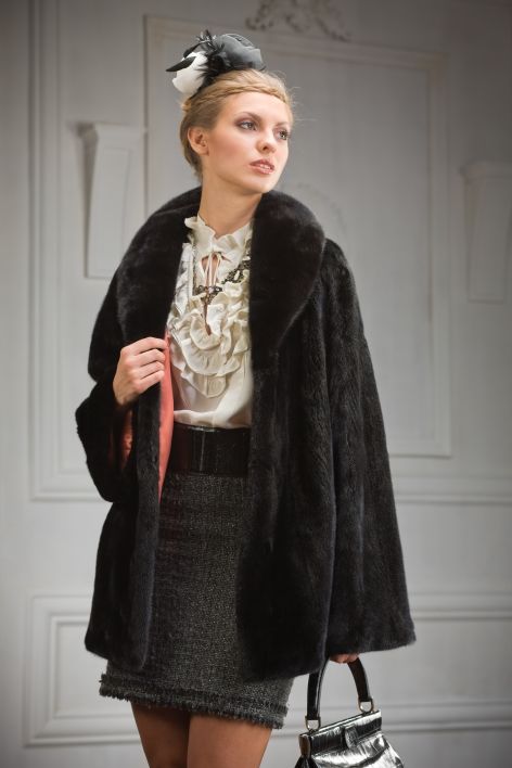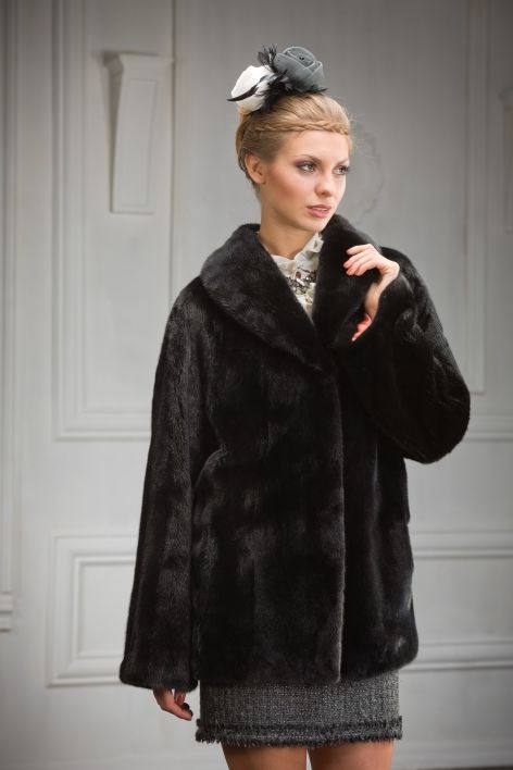 Особую изысканность модели придают детали покроя: широкие рукава, плечо-реглан и обворожительный воротник. Длина шубы составляет 80 см.