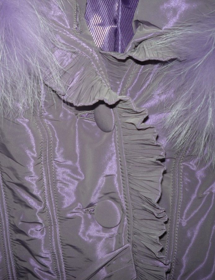 Куртка силуэтного покроя с расклешенным низом создана из материала, цвет которого искрится на солнце. Модель вся состоит из уникальных элементов: рюшей и оборок, оригинально декорированных карманов, эффектной отделки рукавов – настоящий эксклюзив.