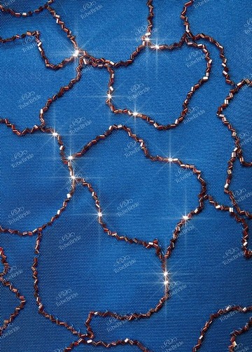 Платье выполнено из тёмно-синего шёлка, который покрыт тонким фатином, украшенным многочисленной вышивкой из бисера. Незамысловатые узоры, сверкающие на солнце, придают платью изюминки и пикантности. В нём вы всегда будете в центре внимания!