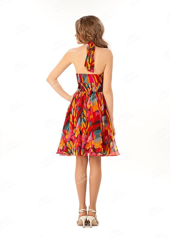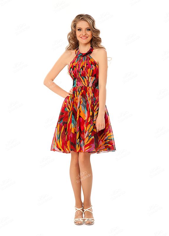 Длина – чуть выше линии колен. Крепится за шеей, в форме «кольца» на завязках. Спина открыта. По линии талии проходит плотная толстая вставка, украшенная пайетками. Она визуально делает обладательницу наряда стройной и грациозной.