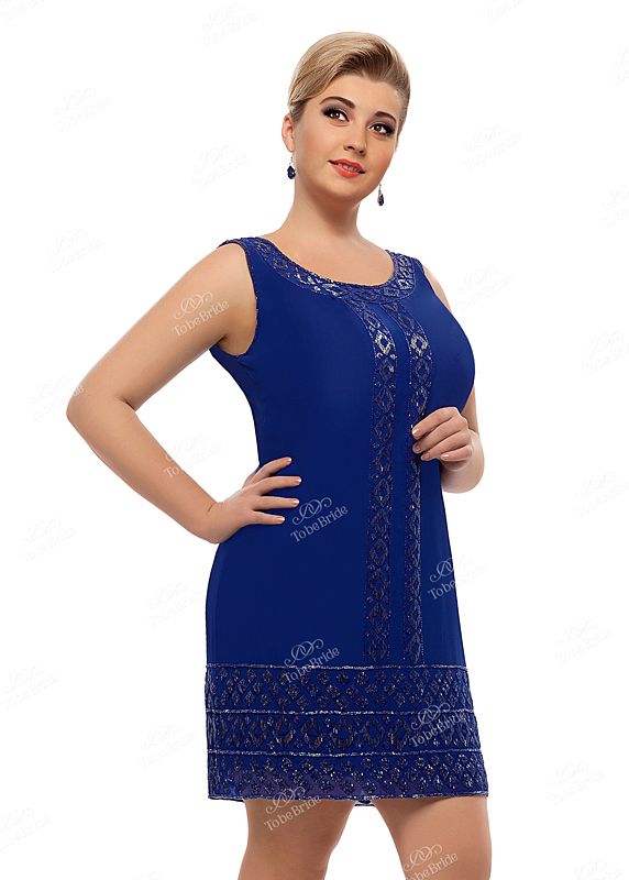Платье выполнено из тёмно-синей ткани, украшено многочисленными вышивками из бисера, которые сливаются в едином узоре. Платье имеет вырез горловины в форме полукруга и две широкие бретели, которые украшены бисером.