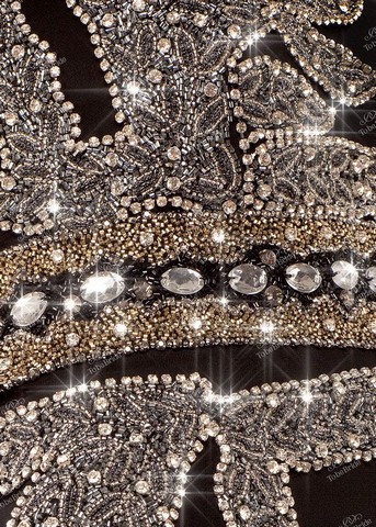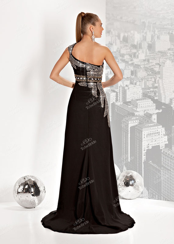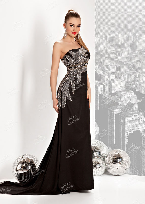 Изысканное длинное черное вечернее платье с роскошной «серебристой» вышивкой искрящимися стразами и бисером, которая украшает верх и, спускаясь на линию бедер, «обволакивает» силуэт, придавая модели особый изыск и утонченность. Особое изящество фасону придает шлейф, а шелк, из которого выполнено платье, мягко струясь, подчеркивает грацию и стан фигуры.
