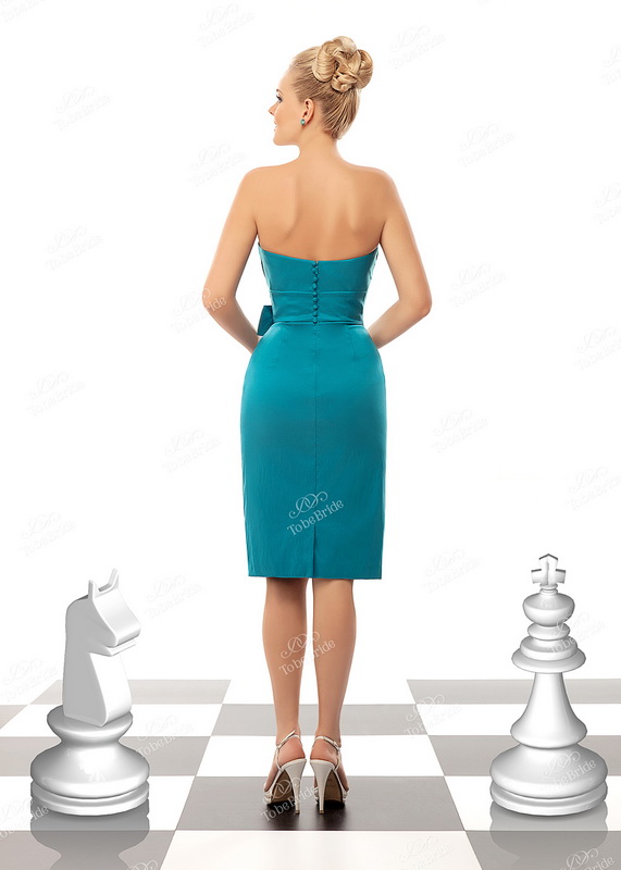 Прилегающее шёлковое платье приятного бирюзового цвета, подходит абсолютно всем девушкам. Интересный корсет, позволяющий сделать акцент на плечах, шее иллинии декольте, украшен несколькими крупными складками, которые сходятся у основания корсета. Плотный широкий пояс, проходящий под грудью, украшен массивным бантом. Благодаря завышенной талии, обладательница наряда кажется стройнее.