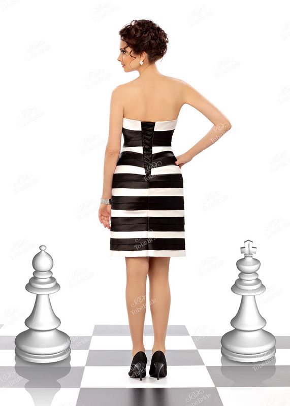 Платье выполнено из шёлка двух цветов – чёрного и белого. Широкие прямые складки, идущие горизонтально, чередуются между собой, образуя контрастный ансамбль.