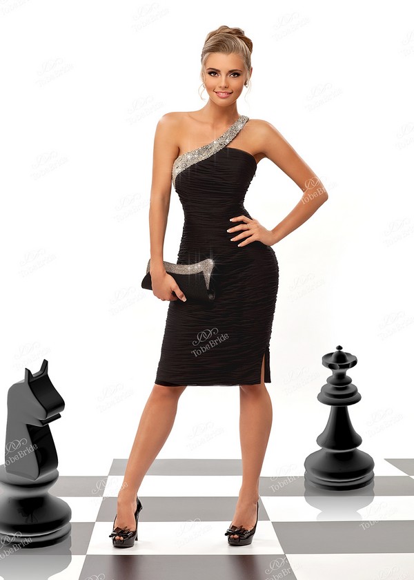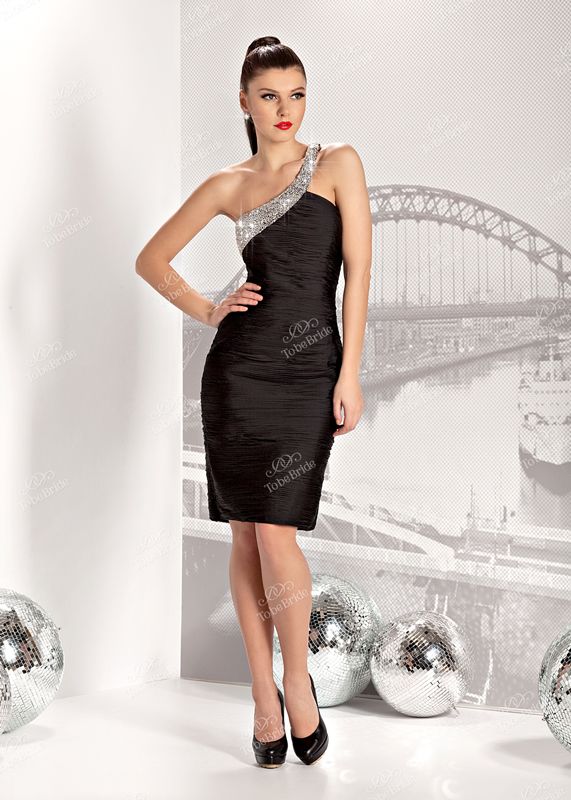 Чёрное вечернее платье украшено широкой бретелью, которая словно опоясывает платье сверху. Бретель украшена многочисленными вышивками из пайеток и камней, которые красиво переливаются.