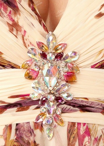По линии талии проходит широкий пояс, который украшен машинной мельчайшими пайетками и узором из крупных цветных камней.