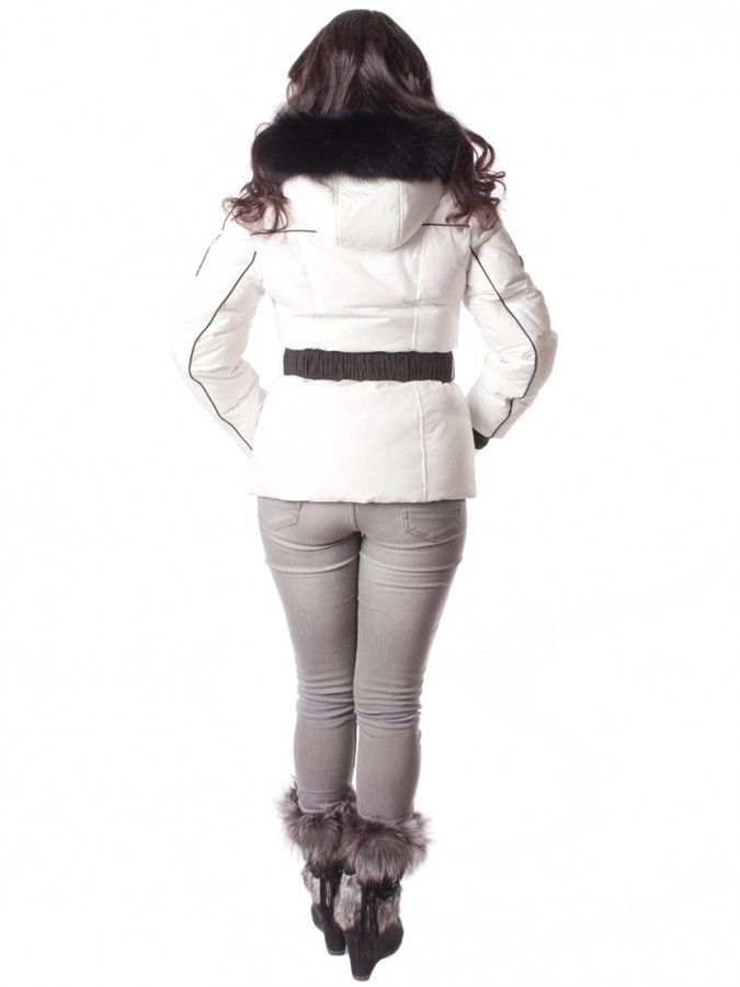 Красивая белая куртка, выполнена из натуральных материалов. Капюшон обшит широкой вставкой из натурального меха песца, благодаря чему, куртка выглядит очень богато и красиво.