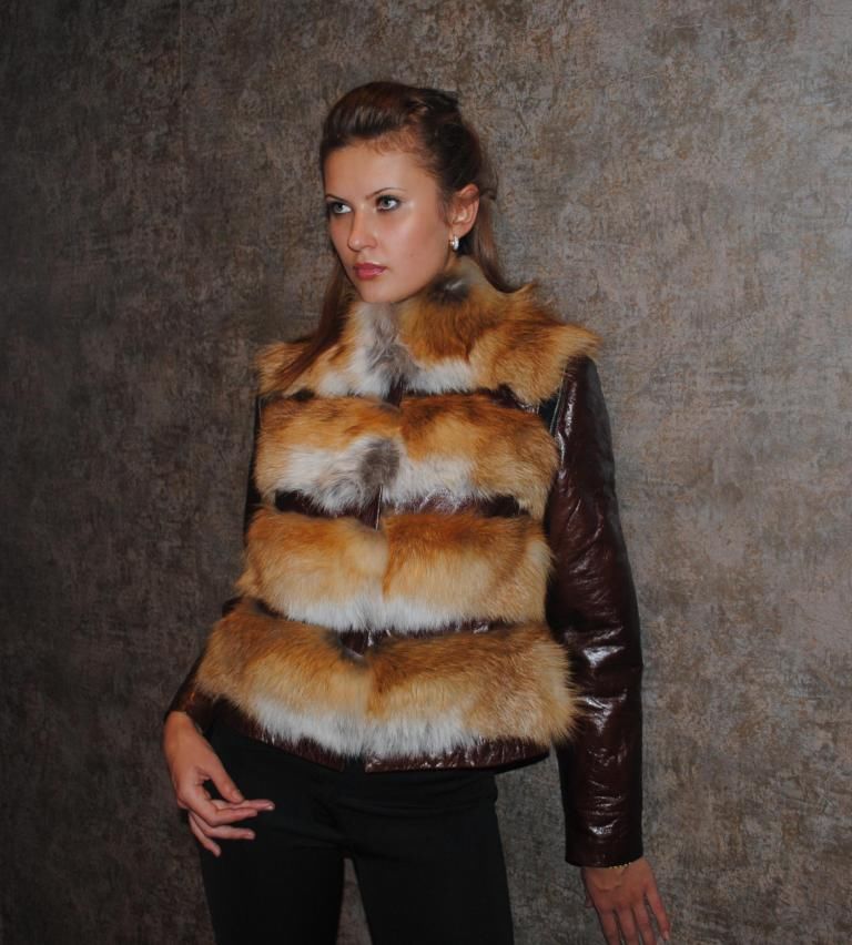 Необычный жилет, созданный из натуральной кожи и натурального меха лисицы огнёвки. Уникальной особенностью этой модели являются рукава, выполненные из натуральной кожи. При желании их легко можно отстегнуть.