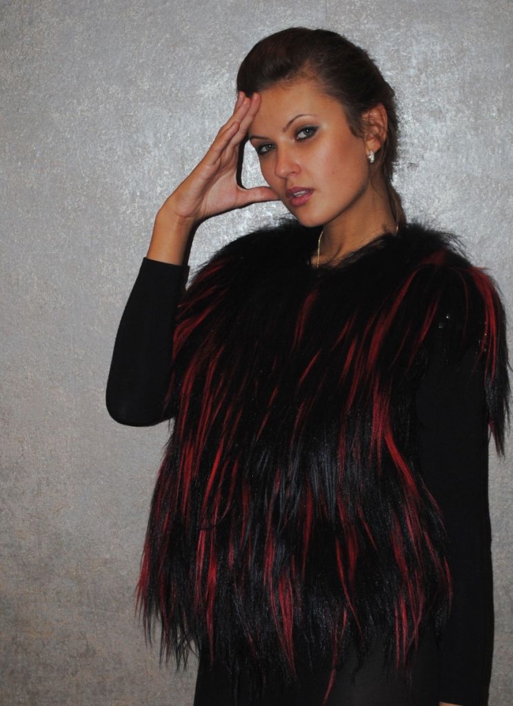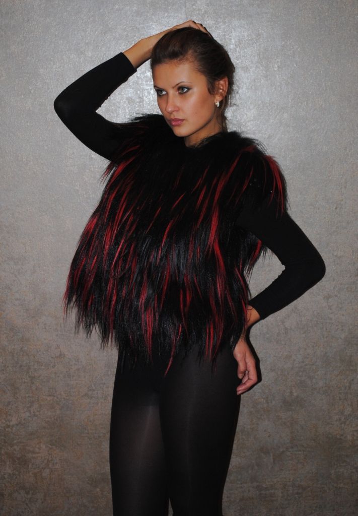Застёгивается жилет на молнию спереди, вырез горловины небольшой. Рукава короткие, слегка прикрывающие плечи. Эта модель смотрится очень ярко и необычно благодаря своеобразной структуре меха. В этом жилете вам обеспечено повышенное внимании е и восхищённые взгляды!