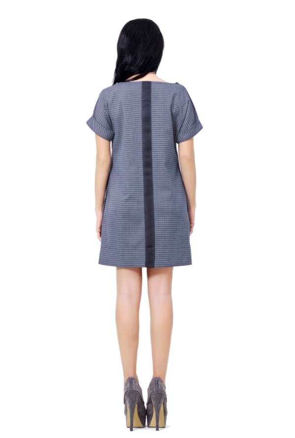 Простой крой платья подчёркнут с помощью контрастной отделки. Застёжки-молнии по плечам - не только функциональный атрибут, но и элемент декора. Декоративная полоска по спинке зрительно вытягивает силуэт.