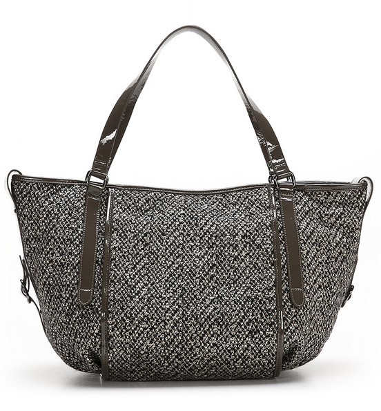 Вместительная и объемная сумка, созданная из плотной ткани, украшена многочисленными вставками из лакированной ткани.