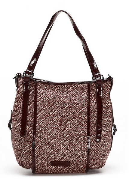 Вместительная и объемная сумка, созданная из плотной ткани, украшена многочисленными вставками из лакированной ткани.