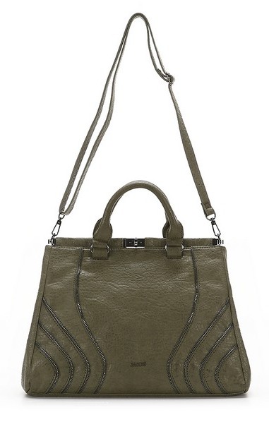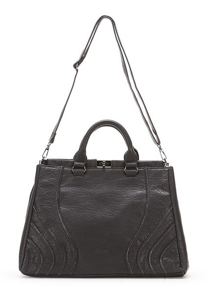 Сумка украшена несколькими кривыми линиями, выполненными из молнии. Застёгивается на металлическую застёжку.