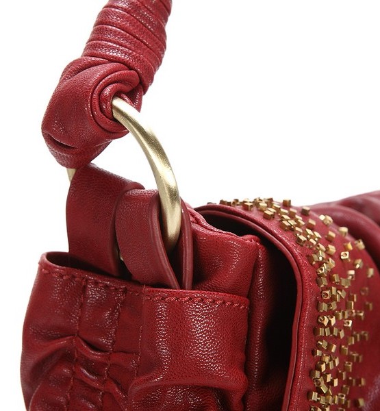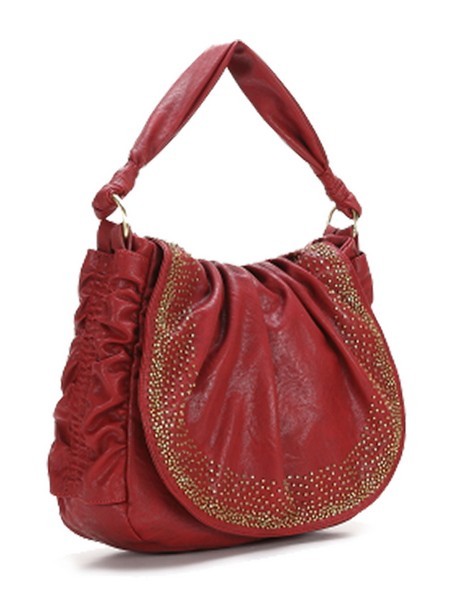 Украшением сумки является широкая каёмка лицевой части, которая вышита золотистым бисером. По бокам, по направлению к ремешку, сумка украшена резинкой и драпировками. Плотный широкий ремешок крепится на широкие металлические кольца.