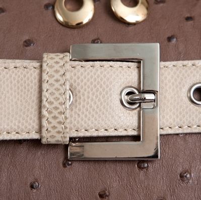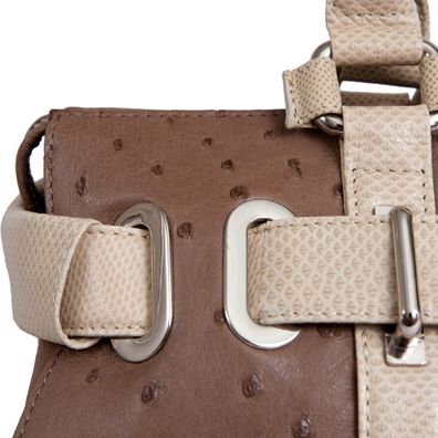 Сумочка выполнена из кожи страуса с отделкой из натуральной кожи песчаной змеи. Модель имеет удобные ручки, внутренняя подкладка - из свиной кожи.