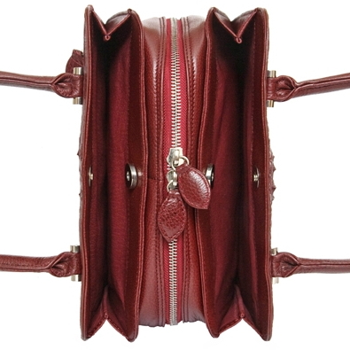 Внутреннее пространство имеет одно отделение и дополнительные карманы для телефона, документов и других мелочей, дополнительный карман на молнии. Удобные ручки. У сумки также есть боковые потайные карманы на магнитных застежках. Все молнии металлические. Подкладка из кожи свиньи.