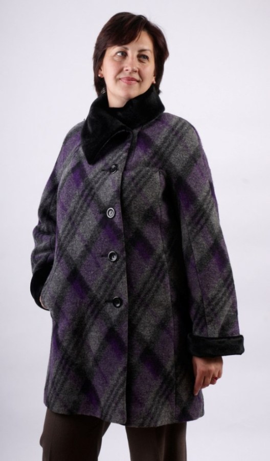 Очень красиво смотрится диагональный рисунок в крупную клетку, дополняющийся черной богатой отделкой воротника и манжет.