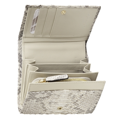 Высококачественная металлическая фурнитура, изумительная отделка кожи питона приятно обрадуют свою обладательницу. В кошельке предусмотрены удобные отделения для мелочи и денежных купюр, а также для кредитных карточек.