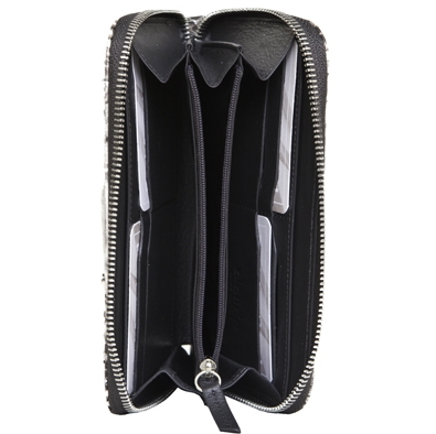Портмоне выполнено из высококачественной плотной кожи питона, с металлической фурнитурой высокого класса, оснащено тремя отделениями: отделение для мелочи на молнии и набор отделений для пластиковых карт.