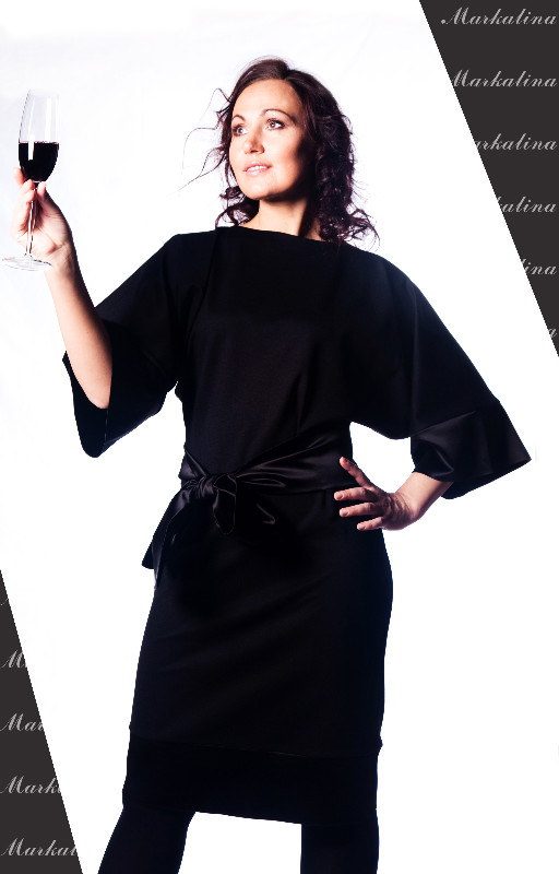 Платье имеет уникальные широкие рукава, длина которых – ниже линии локтя. На талии имеется широкий атласный пояс. Длина платья – ниже линии колен. Подол украшен широкой атласной чёрной вставкой. Юбка платья прямая, прилегающая к телу. Верх – более свободный.