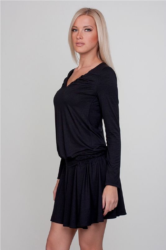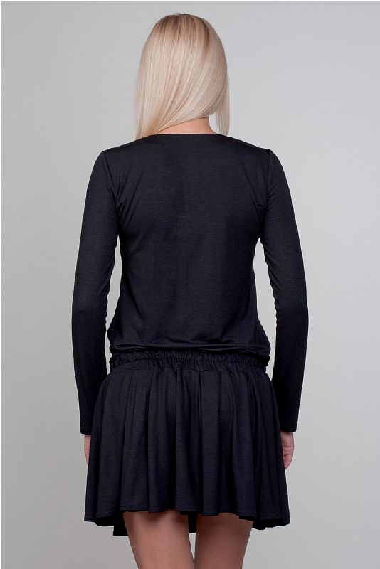 По линии бёдер проходит плотная резинка. От неё спускается короткая юбка, украшенная крупными складками.