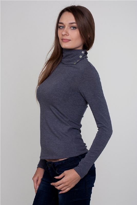 Воротник – высокий, украшен несколькими светлыми пуговицами сбоку.