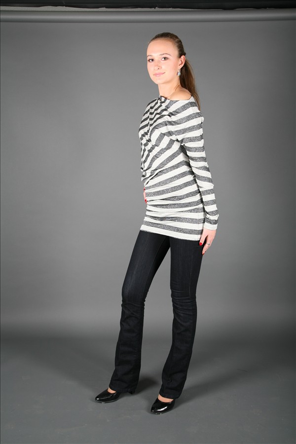 Горизонтальные полоски идут от открытого плеча к другому краю. Длина блузы и рукавов в сочетании с ассиметричным покроем обеспечивают нежные складки по всему изделию. Эта волнистость в сочетании с полосками создают необычайно интересный эффект. Необычный, пикантно оголяющий плечо вырез горловины шикарно акцентирует внимание на шее хозяйки.