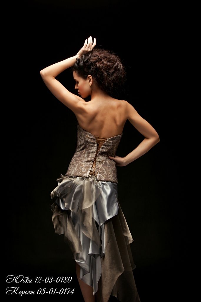 Основная ткань, из которой выполнена данная юбка - серебристый шёлк, дополнительная – тёмно-оливковый прозрачный фатин. Спереди юбка асимметричная, довольно-таки короткая. Сзади – длинная, состоящая из многочисленных вставок ткани – фатина и шёлка, которые красиво контрастируют друг с другом, создавая удивительный эффект.