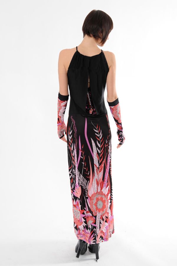 Шикарный крупный цветочный принт великолепно смотрится на темном фоне, отсутствие рукавов подчеркивает изящные руки и дает широкие возможности для комбинирования этого платья с болеро, накидками и меховыми палантинами, а оригинально оформленный верх в стиле американской проймы привлекает восхищенные взгляды.