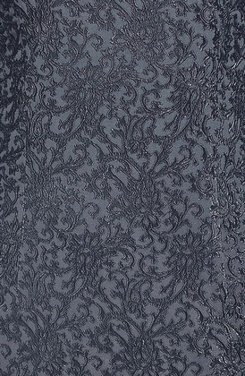 Элегантное вечернее платье-фуляр. Модель выполнена из темно-серого стрейч-жаккарда с узорчатым набивным рисунком. Небольшие рельефы спереди и сзади плавно переходящие в вытачки визуально стройнят и отлично подчеркивают фигуру. Потайная молния застегивающаяся до линии талии расположена по шву спинки, который заканчивается небольшой шлицей. Длина рукава – три четверти. Оригинальная горловина выполнена спереди в форме лодочки, а сзади – глубокий вырез до линии застежки бюстгалтера, тем не менее не открывая его. Низ платья отстрочен широкой отделочной строчкой.