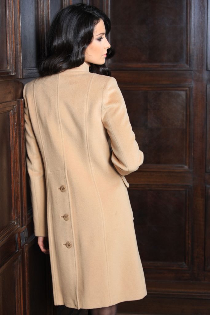 Пальто отличается своим неповторимым и уникальным дизайном. Воротник – небольшая стойка. По бокам украшен крупными серыми пуговицами.