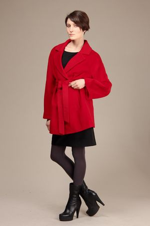 Длина пальто – чуть ниже линии бёдер. Пальто имеет свободный покрой. Застёгивается на несколько крупных пуговиц. Имеется поясок, завязывающийся на талии.