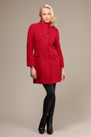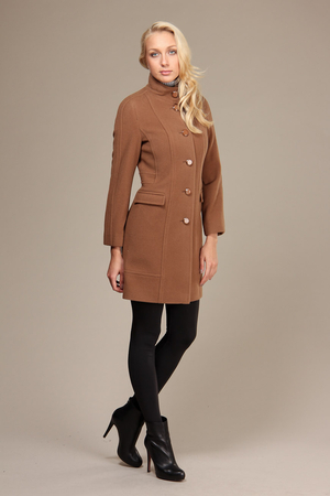 Пальто отличается своим необычным покроем и фасоном. Застёгивается на несколько крупных пуговиц. Воротник – небольшая стойка. Благодаря тому, что пальто выполнено из нескольких крупных лоскутов, оно смотрится необычно и стильно.