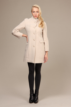 Карманы расположены по бокам, в области талии. Рукава прямые, свободные, украшены рядом из нескольких мелких пуговиц. Длина пальто – ниже линии бёдер.