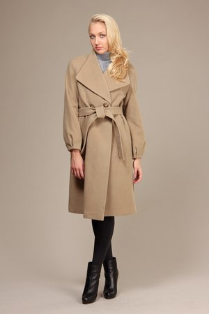 Пальто завязывается на пояс, что делает вас визуально стройнее. Пальто немного приталенное. Рукава прямые, свободные. У основания имеют форму фонарика. Красивая и стильная модель!