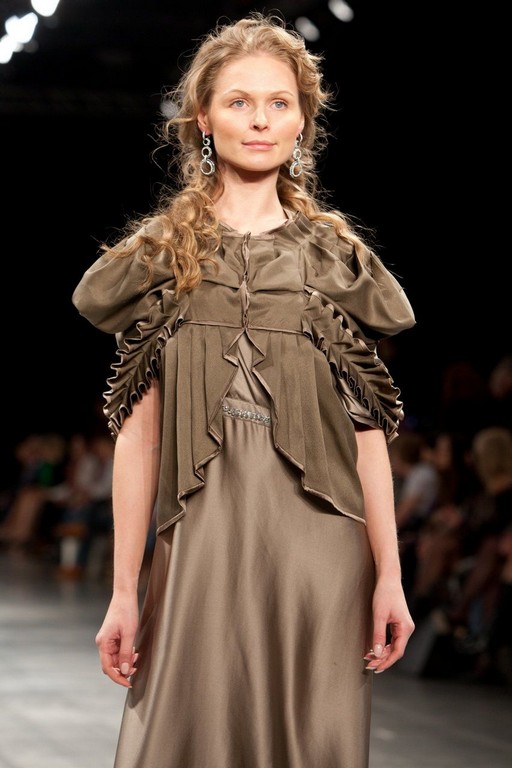 Рукава выполнены в форме очень пышного «фонарика», но тем не менне линия плеча отсутствует. По головине заложены складки, которые мягко переходят в рукав. Дополнительно по краю, рукава украшены присобранной широкой лентой. Пиджак по линии груди отрезной и обработан косой бейкой. Полы пиджака плавно спускаются на спинку; края также обработаны косой бейкой. Под кокеткой полы собраны мягкими складками, за счет чего создается летящий эффект.