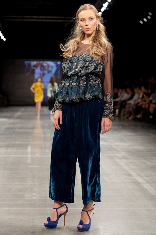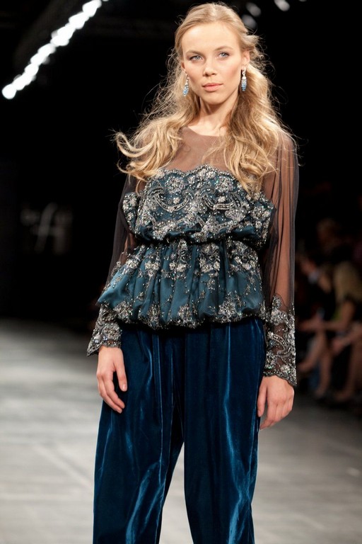 Âåðõ èçäåëèÿ âûïîëíåí èç òêàíè «ñåòî÷êà», êîòîðàÿ íà ìàíæåòàõ è ïîëî÷êå ïåðåõîäèò â ðàñøèòîå òÿæåëîå êðóæåâî. Âûðåç ãîðëîâèíû êðóãëûé. Ïî ëèíèè òàëèè êðóæåâî ñîáðàíî íà ðåçèíêó, ÷òî ïðèäàåò ìîäåëè ïûøíîñòü. Êðóæåâî â ñâîþ î÷åðåäü ðàñøèòî áèñåðîì è ñòåêëÿðóñîì, ÷òî â ñî÷åòàíèè ñ àòëàñíîé îñíîâîé ïðèäàåò ìîäåëè áîãàòûé âèä. Áðþêè â êîìáèíåçîíå âûïîëíåíû èç ñèíåãî áàðõàòà, ñâîáîäíîãî ðîâíîãî ïîêðîÿ. Äëèíà áðþê – äî ùèêîëîòêè. Íèç îáðàáîòàí øèðîêîé îòäåëî÷íîé ñòðî÷êîé. Çà ñ÷åò ñî÷åòàíèÿ â ñåáå íåñêîëüêèõ âèäîâ òêàíåé è îáðàáîòêè, ìîäåëü çàñëóæèâàåò ïðèñòàëüíîãî âíèìàíèÿ.