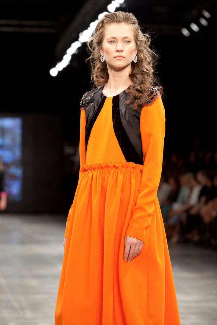 Яркое шелковое платье, выполненное в оригинальном стиле. Вся модель визуально явно разделена на две части. Полочка состоит из двух видов тканей: бархата и шелка. Центральная клиновидная часть выполнена из основной ткани изделия. Боковые же части полочки собраны из чередующихся полос атласа и бархата. На плечах платье дополнено погонами, расшитыми бисером, что придает пикантность данной модели. Вырез горловины круглый. Рукав длинный, зауженный к низу. Край обработан узкой отделочной строчкой. Юбка присобрана по талии и настрочена на полочку. При этом создается широкий пояс в виде рюша, который выделяет линию талии. Длина юбки – ниже колен. На нижний край юбки настрочена широкая бархатная лента, контрастного цвета.