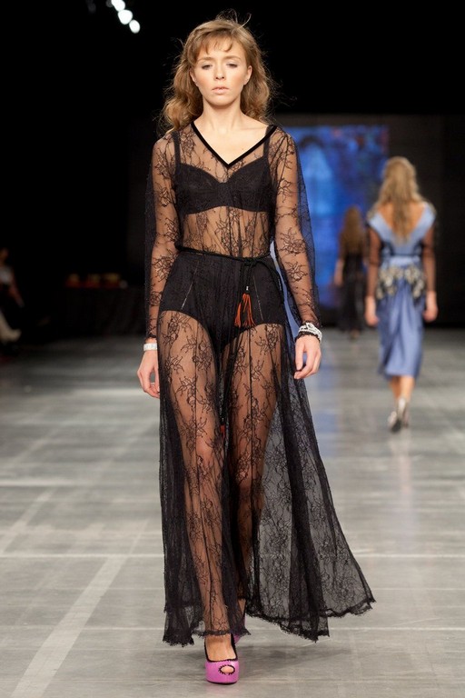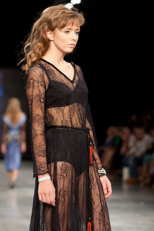 Длинное черное кружевное платье свободного покроя. Модель слегка расклешена к низу. По полочке и спинке проходят вертикальные рельефы. Рукава длинные и обработанные по краю кружевной каймой. Также обработан и низ модели. Широкий треугольный вырез горловины обработан узкой атласной лентой. По линии талии завязан шнурок с большими контрастными кисточками. Данная модель идеально подходит как свободная накидка поверх мальенького черного платья-футляра. Она создает эффект воздушной легкости и придает утонченность вашему образу.
